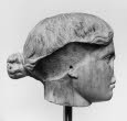 Beschreibung: Der frontal ausgerichtete mädchenhafte Kopf mit großflächigem, fast regungslosem Gesicht trägt eine nahezu symmetrisch geordnete Frisur mit frei abstehendem Nackenknoten. Das Haar auf dem Oberkopf ist von einem Mittelscheitel in feinen welligen Strähnen nach vorn und zu den Seiten gelegt. Auf dem Hinterkopf setzt es sich von einem Wirbel ausgehend als eigenes Segment mit gabelförmiger Trennung von dem übrigen Kalottenhaar ab. Die Abgrenzung der Kalottenfrisur zwischen Oberkopf und Hinterkopf betonen je eine dickere, doppelsträhnige Locke, die vom Wirbel seitlich auf beide Ohren zuläuft. Von der Stirn über die Schläfen führen kranzartig zwei breite großwellige Stränge nach hinten und vereinigen sich im eng geschnürten Nackenschopf mit dem nach hinten gekämmten Kalottenhaar. Der Haarkranz bedeckte die Ohren nur zum Teil; die Ohrläppchen liegen frei, durchbohrt für zu applizierenden Schmuck. Die zumeist flach reliefierte Frisur liegt insgesamt dicht an. Der Erhaltungszustand hat unter der Restaurierung, Überarbeitung und Ergänzung im 18. Jh. und durch die Schäden im 2. Weltkrieg beträchtlich gelitten, so dass nur eine pauschale Datierung der Kopie in das 1. Jh. n. Chr. möglich ist. Archäologisch von Belang bleibt die Replik wegen ihrer Maße und antiquarischer Details der Haartracht (vgl. Replik Kat. 2.8).